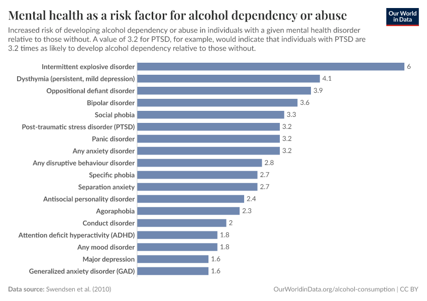 The results in the chart show the increased risk of developing alcohol dependency (we show results for illicit drug dependency in our topic page on drug use) for someone with a given mental health disorder (relative to those without). For example, a value of 3.6 for bipolar disorder indicates that illicit drug dependency became more than three times more likely in individuals with bipolar disorder than those without. The risk of an alcohol use disorder is highest in individuals with intermittent explosive disorder, dysthymia, ODD, bipolar disorder, and social phobia.