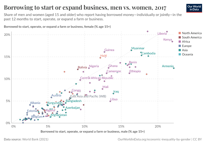 Above we show that there are large gender gaps in land ownership across low-income countries. Here we show that there are also large gaps in terms of access to borrowed capital.