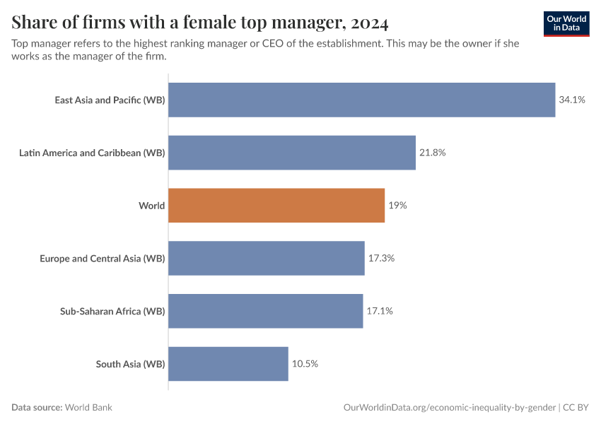 As we can see, all over the world firms tend to be managed by men. And, globally, only about 18% of firms have a female manager.