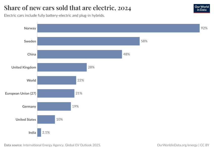 Globally, over 1-in-5 (22%) of new cars sold were electric in 2024. This share was 92% in Norway, and in China, it was almost 50%.