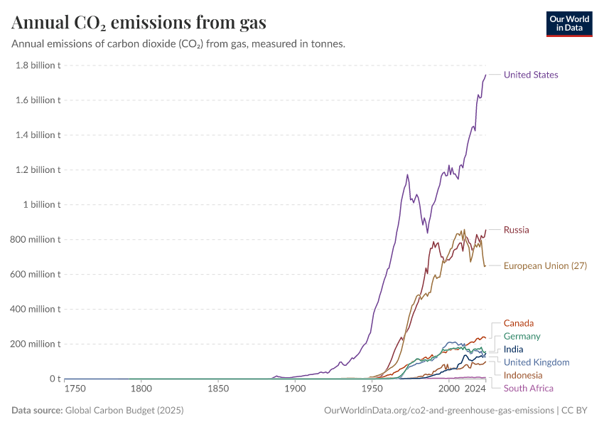 This interactive chart shows per capita CO2 emissions from gas, measured in tonnes per person per year.