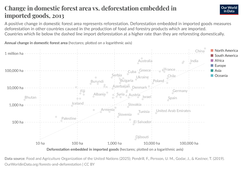 In the chart we see the comparison between the change in domestic forest area, and deforestation driven by imported goods.5 On the vertical axis we have the domestic change in forest area: this is shown only for countries where the forest area is increasing. Since there is often year-to-year variability in deforestation or reforestation rates, this is shown as the five-year average. On the x-axis we have imported deforestation. The grey line marks where the area of domestic regrowth of forests is exactly equal to imported deforestation. Countries that lie along this line would have a net-neutral impact on global forests: the area they are causing to deforestation overseas is exactly as large as the area they are regrowing at home.