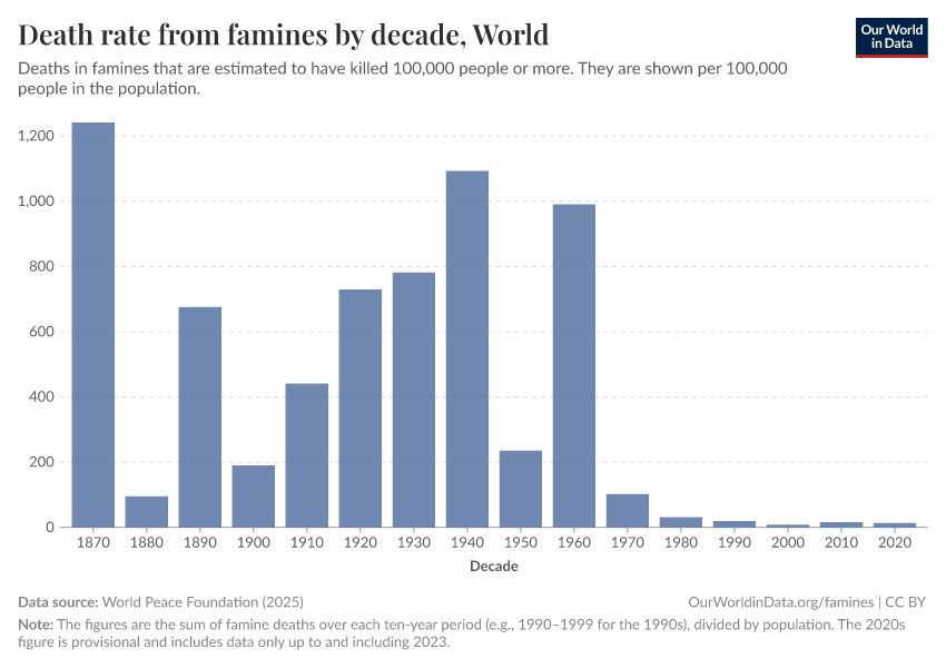 But while the number of deaths caused by individual famines is often subject to a good deal of uncertainty, the overall trend over time is very clear: compared to earlier historical periods, far fewer people have died in famines in recent decades.