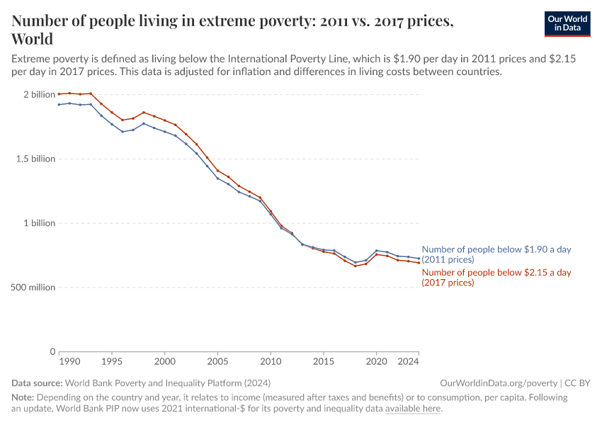 The World Bank has since updated its methods, and now measures incomes in 2021 international-$. As part of these changes, the International Poverty Line used to measure extreme poverty has also been updated: from $1.90 a day (in 2011 prices) to $2.15 a day (in 2017 prices) to $3 a day (in 2021 prices).