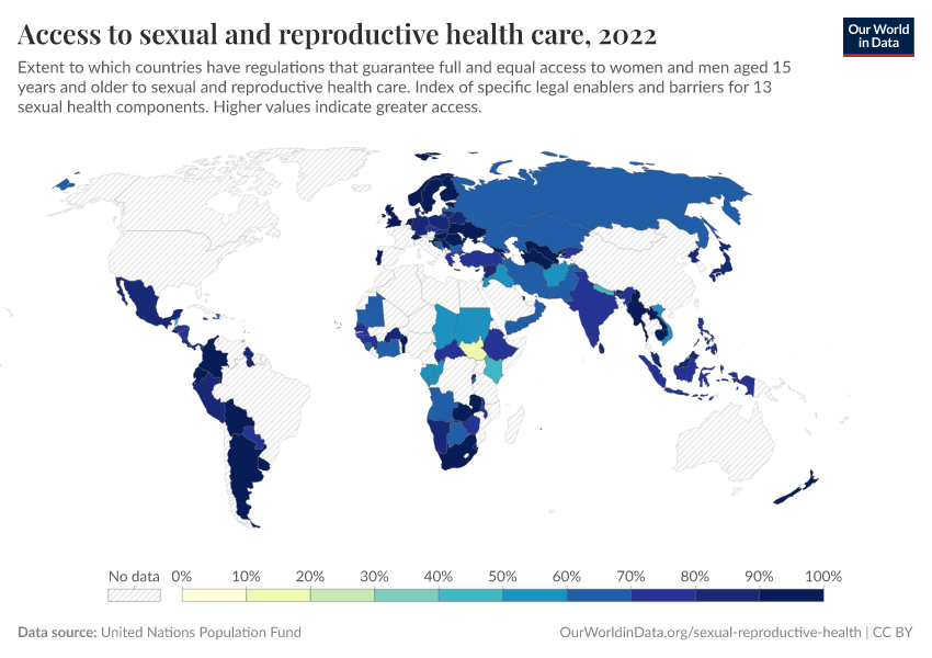 “Data Page: Access to sexual and reproductive health care”. Our World in Data (2026). Data adapted from United Nations Population Fund. Retrieved from https://chrome-plugin.owid.pages.dev/grapher/access-to-sexual-health-care-and-education [online resource]How to cite this data