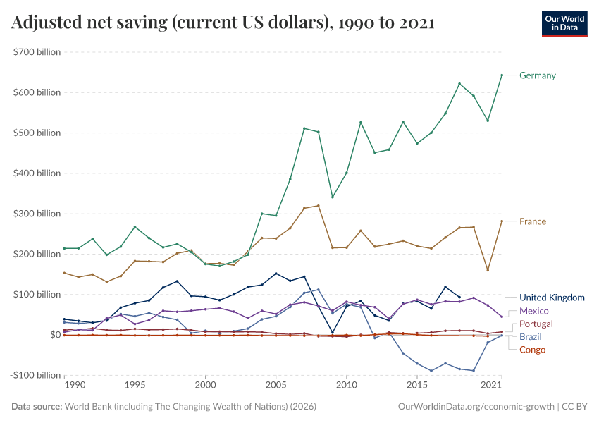 “Data Page: Adjusted net saving (current US dollars)”. Our World in Data (2026). Data adapted from World Bank (including The Changing Wealth of Nations). Retrieved from https://chrome-plugin.owid.pages.dev/grapher/adjusted-net-saving-current-us-dollars [online resource]How to cite this data