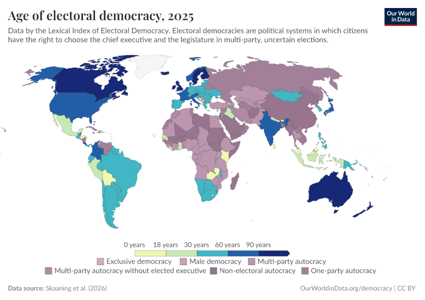 Skaaning et al. (2025) – processed by Our World in Data. “Age of electoral democracy” [dataset]. Skaaning et al., “Lexical Index of Electoral Democracy (LIED) v6.8” [original data]. Retrieved January 9, 2026 from https://chrome-plugin.owid.pages.dev/grapher/age-of-electoral-democracy-lexical