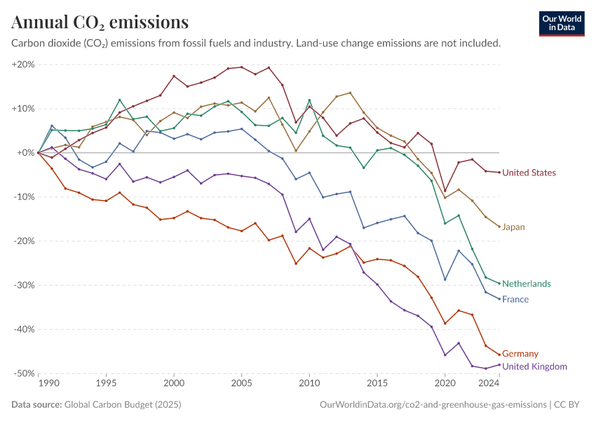 Global Carbon Budget (2025) – with major processing by Our World in Data. “Annual CO₂ emissions” [dataset]. Global Carbon Project, “Global Carbon Budget v15” [original data]. Retrieved January 9, 2026 from https://chrome-plugin.owid.pages.dev/grapher/annual-co2-emissions-per-country
