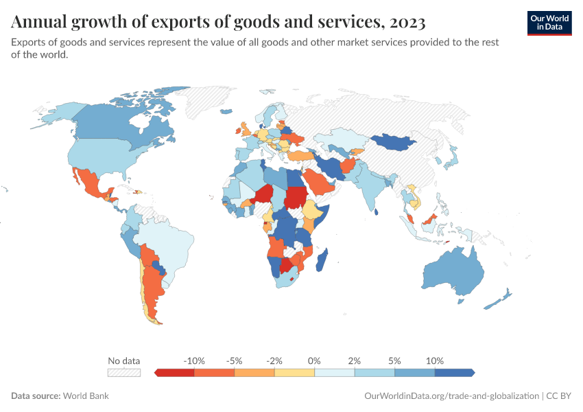 “Data Page: Annual growth of exports of goods and services”. Our World in Data (2026). Data adapted from World Bank. Retrieved from https://chrome-plugin.owid.pages.dev/grapher/annual-growth-of-exports-of-goods-and-services [online resource]How to cite this data