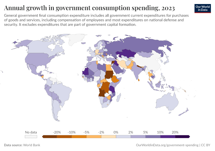 “Data Page: Annual growth in government consumption spending”. Our World in Data (2026). Data adapted from World Bank. Retrieved from https://chrome-plugin.owid.pages.dev/grapher/annual-growth-of-general-government-final-consumption-expenditure [online resource]How to cite this data