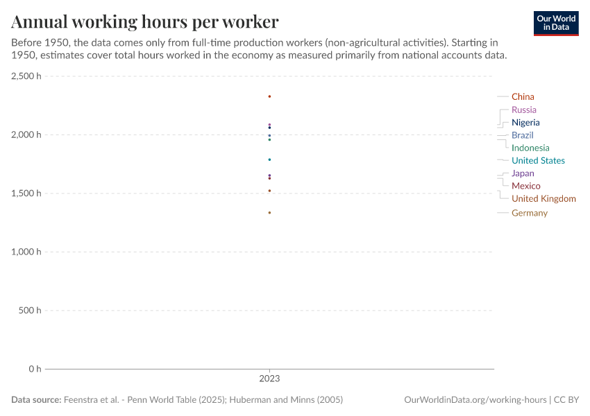 “Data Page: Annual working hours per worker”, part of the following publication: Charlie Giattino, Esteban Ortiz-Ospina, and Max Roser (2020) - “Working Hours”. Data adapted from Feenstra et al., Huberman and Minns. Retrieved from https://chrome-plugin.owid.pages.dev/grapher/annual-working-hours-per-worker [online resource]