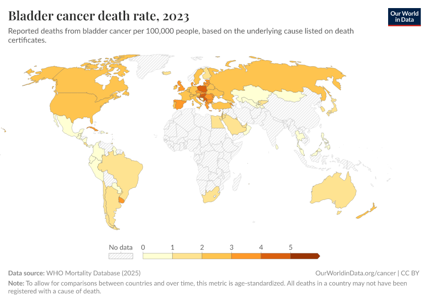“Data Page: Bladder cancer death rate”, part of the following publication: Saloni Dattani, Fiona Spooner, Hannah Ritchie, and Max Roser (2023) - “Causes of Death”. Data adapted from WHO Mortality Database. Retrieved from https://chrome-plugin.owid.pages.dev/grapher/bladder-cancer-death-rate [online resource]How to cite this data
