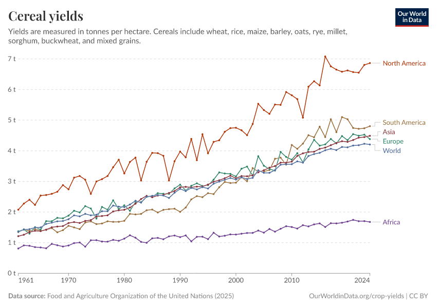 Food and Agriculture Organization of the United Nations (2025) – with major processing by Our World in Data. “Cereal yields – UN FAO” [dataset]. Food and Agriculture Organization of the United Nations, “Production: Crops and livestock products” [original data]. Retrieved January 9, 2026 from https://chrome-plugin.owid.pages.dev/grapher/cereal-yield