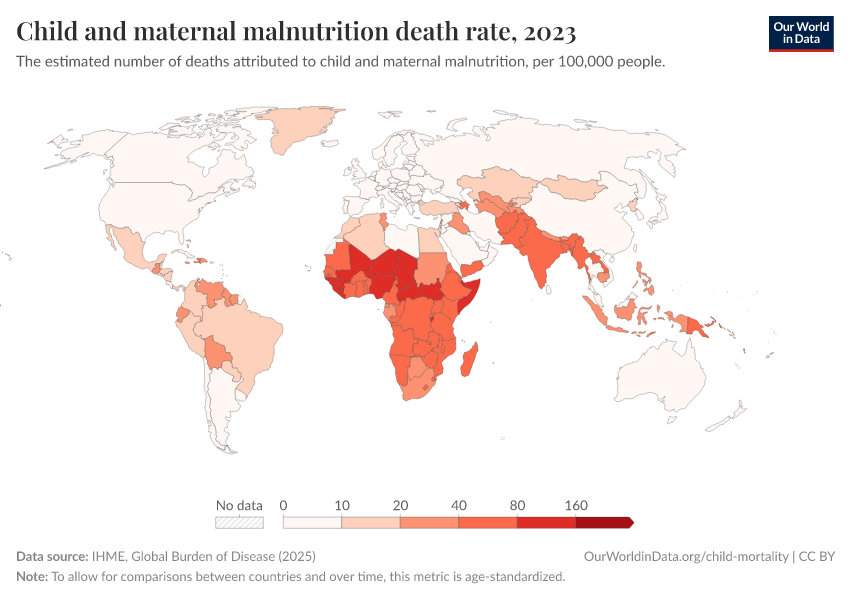 IHME, Global Burden of Disease (2024) – with minor processing by Our World in Data. “Child and maternal malnutrition death rate” [dataset]. IHME, Global Burden of Disease, “Global Burden of Disease - Risk Factors” [original data]. Retrieved January 9, 2026 from https://chrome-plugin.owid.pages.dev/grapher/child-and-maternal-malnutrition-death-rate
