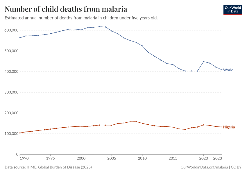 IHME, Global Burden of Disease (2024) – with minor processing by Our World in Data. “Number of child deaths from malaria” [dataset]. IHME, Global Burden of Disease, “Global Burden of Disease - Deaths and DALYs” [original data]. Retrieved January 9, 2026 from https://chrome-plugin.owid.pages.dev/grapher/child-deaths-from-malaria-number