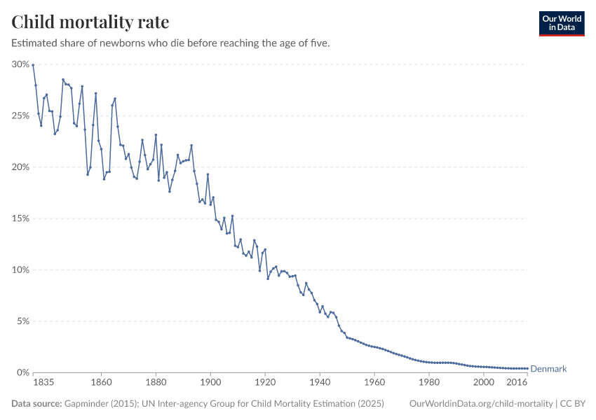Gapminder (2015); UN Inter-agency Group for Child Mortality Estimation (2025) – processed by Our World in Data. “Child mortality rate – Gapminder; UN IGME – Long-run data” [dataset]. United Nations Inter-agency Group for Child Mortality Estimation, “United Nations Inter-agency Group for Child Mortality Estimation”; Gapminder, “Child mortality rate under age five v7”; Gapminder based on UN IGME & UN WPP, “Under-five Mortality v11”; Various sources, “Population” [original data]. Retrieved January 9, 2026 from https://chrome-plugin.owid.pages.dev/grapher/child-mortality