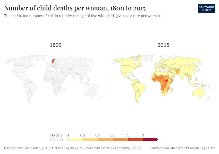 Gapminder (2015); UN Inter-agency Group for Child Mortality Estimation (2025) – processed by Our World in Data. “Child mortality rate – Gapminder; UN IGME – Long-run data” [dataset]. United Nations Inter-agency Group for Child Mortality Estimation, “United Nations Inter-agency Group for Child Mortality Estimation”; Gapminder, “Child mortality rate under age five v7”; Gapminder based on UN IGME & UN WPP, “Under-five Mortality v11”; United Nations, “World Population Prospects”; Gapminder, “Babies per woman (total fertility rate) v12”; Various sources, “Population” [original data]. Retrieved January 9, 2026 from https://chrome-plugin.owid.pages.dev/grapher/children-died-before-five-per-woman