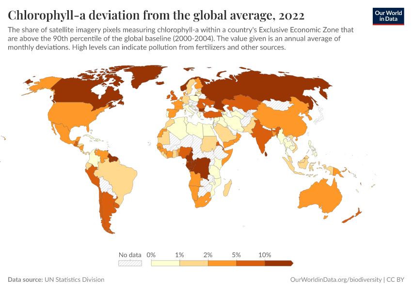 UN Statistics Division – processed by Our World in Data. “Chlorophyll-a deviation from the global average” [dataset]. UN Statistics Division, “World Environment Situation Room” [original data]. Retrieved January 9, 2026 from https://chrome-plugin.owid.pages.dev/grapher/chlorophyll-a-deviation-from-the-global-average