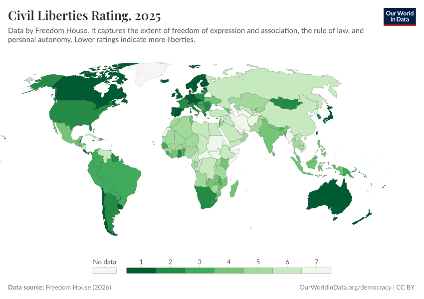 Freedom House (2025) – processed by Our World in Data. “Civil liberties rating” [dataset]. Freedom House, “Freedom in the World” [original data]. Retrieved January 9, 2026 from https://chrome-plugin.owid.pages.dev/grapher/civil-liberties-rating-fh