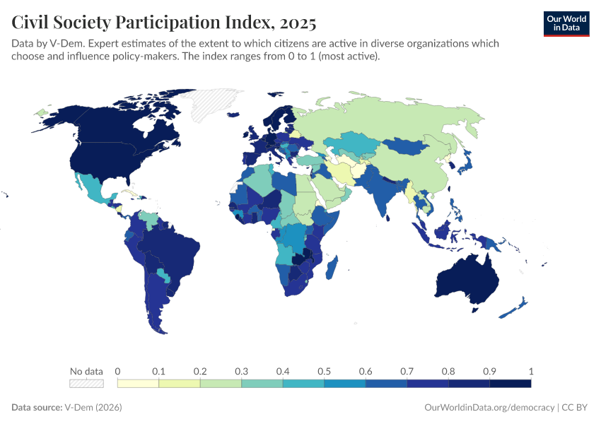 V-Dem (2025) – processed by Our World in Data. “Civil society participation index – V-Dem” [dataset]. V-Dem, “Democracy report v15” [original data]. Retrieved January 9, 2026 from https://chrome-plugin.owid.pages.dev/grapher/civil-society-participation-index