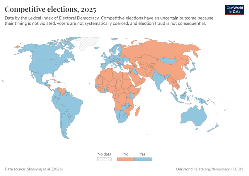 Skaaning et al. (2025) – processed by Our World in Data. “Competitive elections” [dataset]. Skaaning et al., “Lexical Index of Electoral Democracy (LIED) v6.8” [original data]. Retrieved January 9, 2026 from https://chrome-plugin.owid.pages.dev/grapher/competitive-elections-lexical