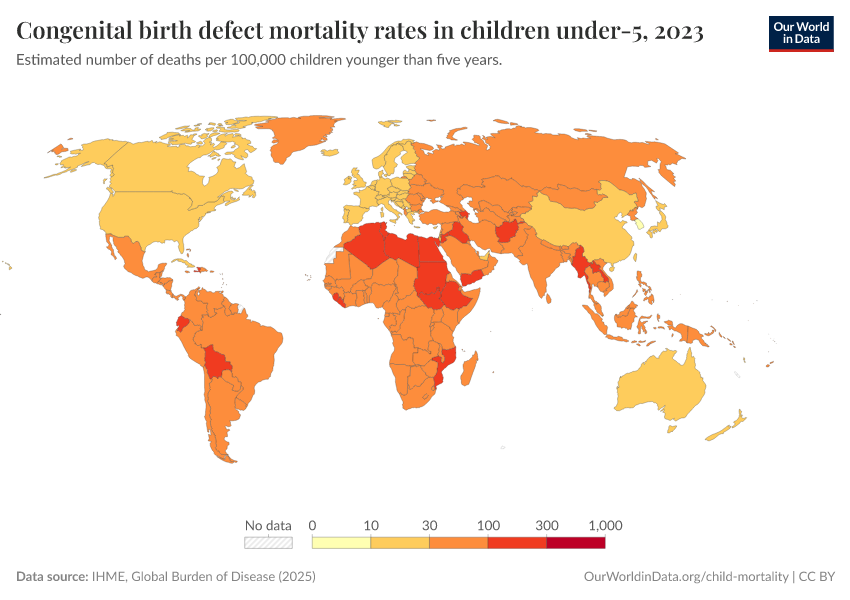 IHME, Global Burden of Disease (2024) – with minor processing by Our World in Data. “Congenital birth defect mortality rates in children under-5” [dataset]. IHME, Global Burden of Disease, “Global Burden of Disease - Deaths and DALYs” [original data]. Retrieved January 9, 2026 from https://chrome-plugin.owid.pages.dev/grapher/congenital-birth-defect-mortality-rates-in-children-under-5