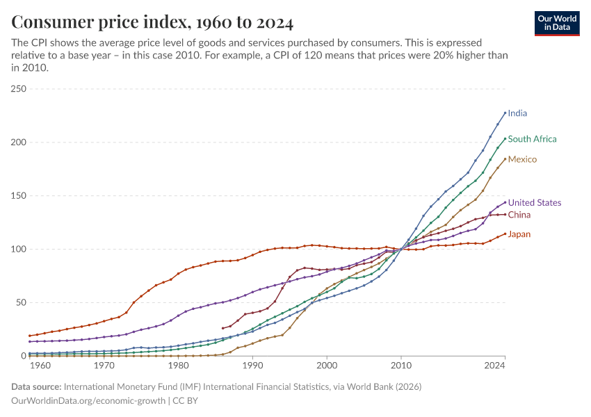 International Monetary Fund (IMF) International Financial Statistics, via World Bank (2025) – processed by Our World in Data. “Consumer price index” [dataset]. International Monetary Fund (IMF) International Financial Statistics, via World Bank, “World Development Indicators 122” [original data]. Retrieved January 9, 2026 from https://chrome-plugin.owid.pages.dev/grapher/consumer-price-index