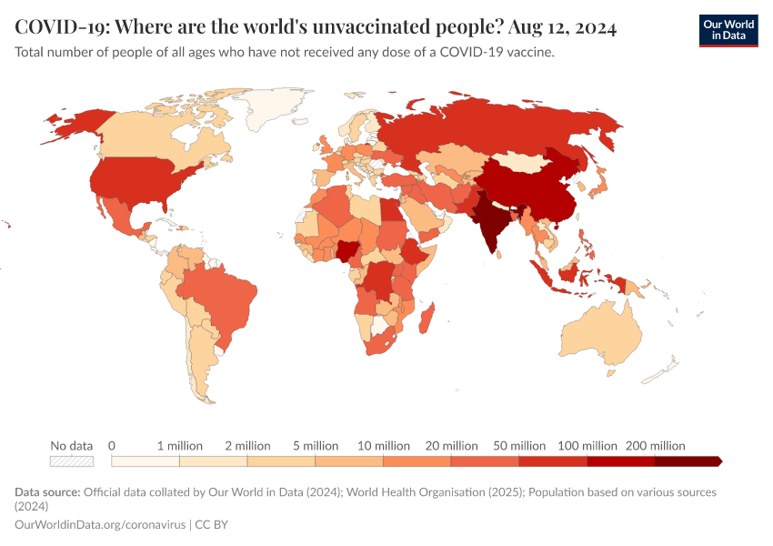 Official data collated by Our World in Data (2024); World Health Organisation (2025); Population based on various sources (2024) – with major processing by Our World in Data. “COVID-19: Where are the world's unvaccinated people?” [dataset]. Official data collated by Our World in Data, “COVID-19, vaccinations”; World Health Organisation, “COVID-19, vaccinations (WHO)”; Various sources, “Population” [original data]. Retrieved January 9, 2026 from https://chrome-plugin.owid.pages.dev/grapher/covid-world-unvaccinated-people