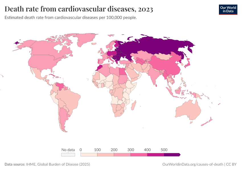 IHME, Global Burden of Disease (2024) – with minor processing by Our World in Data. “Death rate from cardiovascular diseases” [dataset]. IHME, Global Burden of Disease, “Global Burden of Disease - Deaths and DALYs” [original data]. Retrieved January 9, 2026 from https://chrome-plugin.owid.pages.dev/grapher/death-rate-from-cardiovascular-diseases
