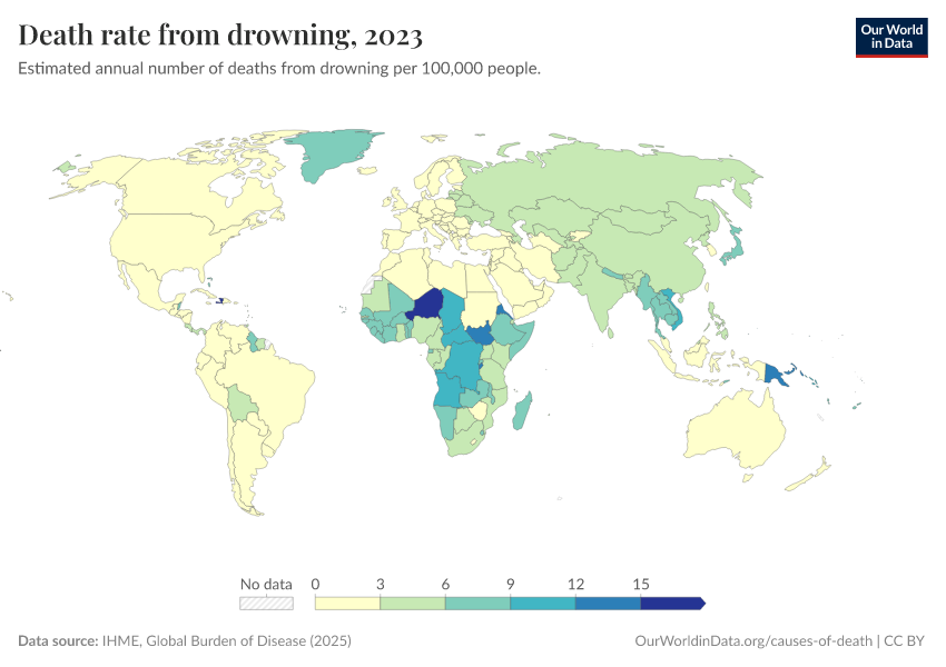 IHME, Global Burden of Disease (2024) – with minor processing by Our World in Data. “Death rate from drowning” [dataset]. IHME, Global Burden of Disease, “Global Burden of Disease - Deaths and DALYs” [original data]. Retrieved January 9, 2026 from https://chrome-plugin.owid.pages.dev/grapher/death-rate-from-drowning