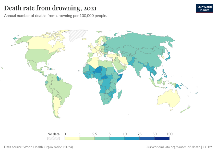 World Health Organization (2024) – with major processing by Our World in Data. “Death rate from drowning” [dataset]. World Health Organization, “Global Health Estimates” [original data]. Retrieved January 9, 2026 from https://chrome-plugin.owid.pages.dev/grapher/death-rate-from-drowning-ghe
