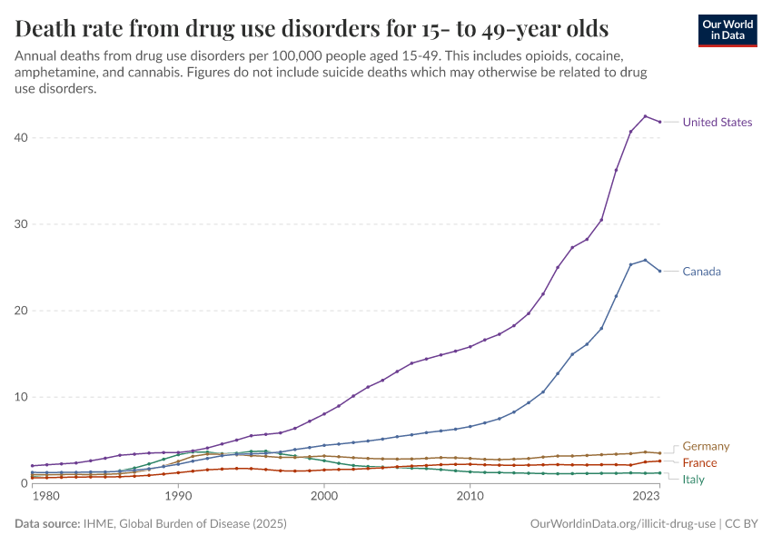 IHME, Global Burden of Disease (2024) – with minor processing by Our World in Data. “Death rate from drug use disorders for 15- to 49-year olds” [dataset]. IHME, Global Burden of Disease, “Global Burden of Disease - Deaths and DALYs” [original data]. Retrieved January 9, 2026 from https://chrome-plugin.owid.pages.dev/grapher/death-rate-from-drug-use-disorders-for-15--to-49-year-olds