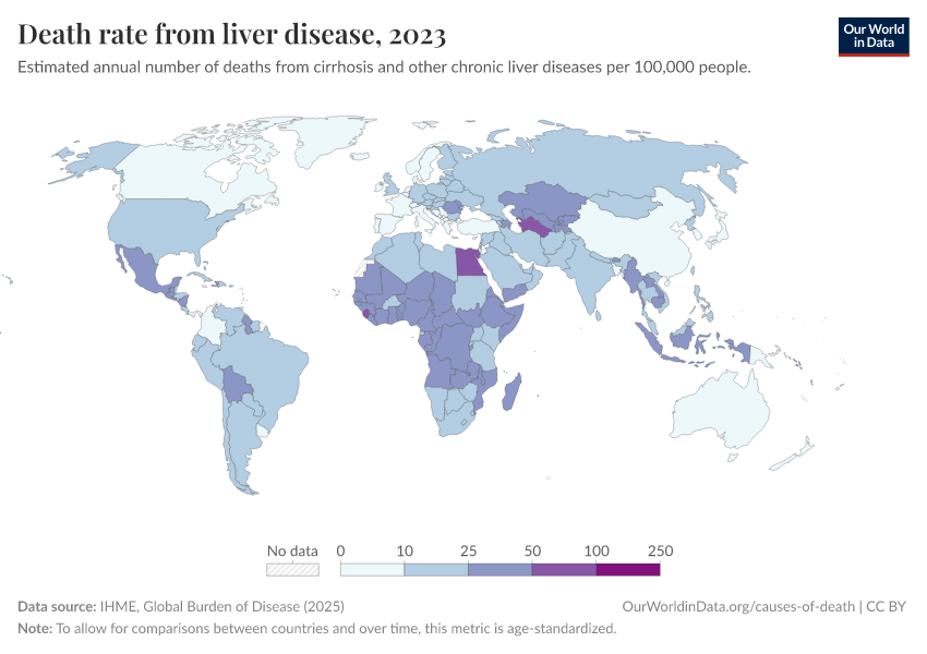 IHME, Global Burden of Disease (2024) – with minor processing by Our World in Data. “Death rate from liver disease” [dataset]. IHME, Global Burden of Disease, “Global Burden of Disease - Deaths and DALYs” [original data]. Retrieved January 9, 2026 from https://chrome-plugin.owid.pages.dev/grapher/death-rate-from-liver-disease