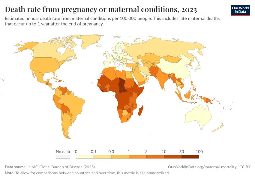 IHME, Global Burden of Disease (2024) – with minor processing by Our World in Data. “Death rate from pregnancy or maternal conditions” [dataset]. IHME, Global Burden of Disease, “Global Burden of Disease - Deaths and DALYs” [original data]. Retrieved January 9, 2026 from https://chrome-plugin.owid.pages.dev/grapher/death-rate-from-maternal-disorders-ihme
