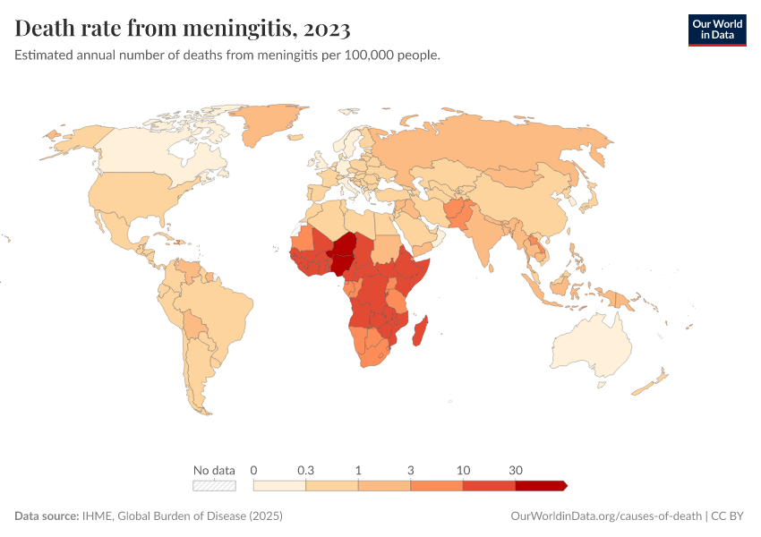 IHME, Global Burden of Disease (2024) – with minor processing by Our World in Data. “Death rate from meningitis” [dataset]. IHME, Global Burden of Disease, “Global Burden of Disease - Deaths and DALYs” [original data]. Retrieved January 9, 2026 from https://chrome-plugin.owid.pages.dev/grapher/death-rate-from-meningitis-gbd
