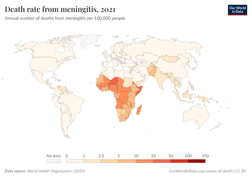 World Health Organization (2024) – with major processing by Our World in Data. “Death rate from meningitis” [dataset]. World Health Organization, “Global Health Estimates” [original data]. Retrieved January 9, 2026 from https://chrome-plugin.owid.pages.dev/grapher/death-rate-from-meningitis-who