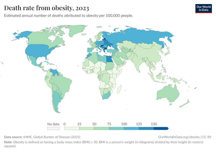 IHME, Global Burden of Disease (2024) – with minor processing by Our World in Data. “Death rate from obesity” [dataset]. IHME, Global Burden of Disease, “Global Burden of Disease - Risk Factors” [original data]. Retrieved January 9, 2026 from https://chrome-plugin.owid.pages.dev/grapher/death-rate-from-obesity-gbd