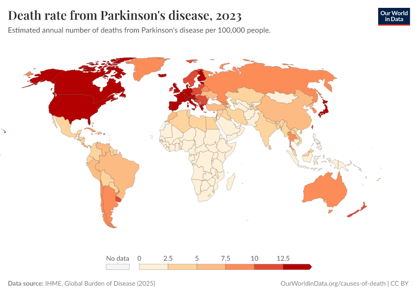 IHME, Global Burden of Disease (2024) – with minor processing by Our World in Data. “Death rate from Parkinson's disease” [dataset]. IHME, Global Burden of Disease, “Global Burden of Disease - Deaths and DALYs” [original data]. Retrieved January 9, 2026 from https://chrome-plugin.owid.pages.dev/grapher/death-rate-from-parkinsons-disease-gbd