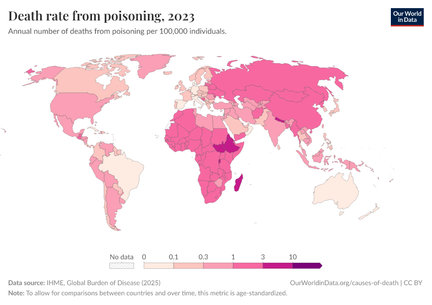 IHME, Global Burden of Disease (2024) – with minor processing by Our World in Data. “Death rate from poisoning” [dataset]. IHME, Global Burden of Disease, “Global Burden of Disease - Deaths and DALYs” [original data]. Retrieved January 9, 2026 from https://chrome-plugin.owid.pages.dev/grapher/death-rate-from-poisoning