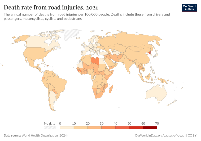 World Health Organization (2024) – with major processing by Our World in Data. “Death rate from road injuries” [dataset]. World Health Organization, “Global Health Estimates” [original data]. Retrieved January 9, 2026 from https://chrome-plugin.owid.pages.dev/grapher/death-rate-from-road-accidents-ghe