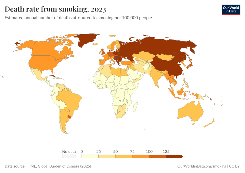 IHME, Global Burden of Disease (2024) – with minor processing by Our World in Data. “Death rate from smoking” [dataset]. IHME, Global Burden of Disease, “Global Burden of Disease - Risk Factors” [original data]. Retrieved January 9, 2026 from https://chrome-plugin.owid.pages.dev/grapher/death-rate-from-smoking