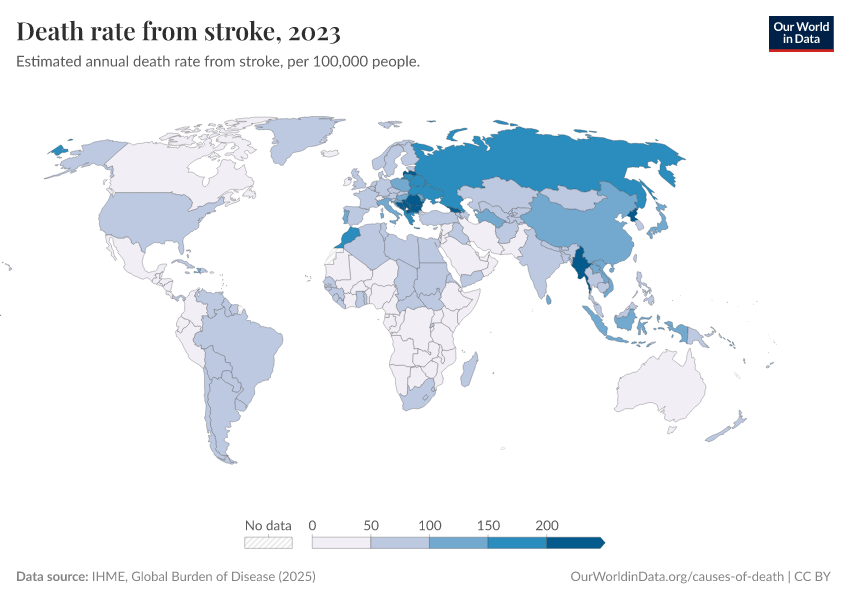 IHME, Global Burden of Disease (2024) – with minor processing by Our World in Data. “Death rate from stroke” [dataset]. IHME, Global Burden of Disease, “Global Burden of Disease - Deaths and DALYs” [original data]. Retrieved January 9, 2026 from https://chrome-plugin.owid.pages.dev/grapher/death-rate-from-strokes