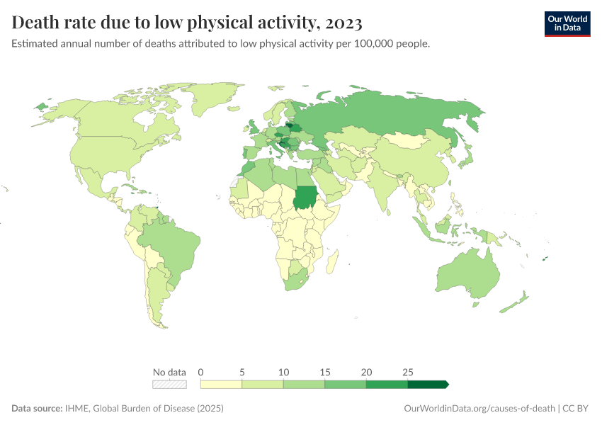 “Data Page: Death rate due to low physical activity”, part of the following publication: Esteban Ortiz-Ospina and Max Roser (2016) - “Global Health”. Data adapted from IHME, Global Burden of Disease. Retrieved from https://chrome-plugin.owid.pages.dev/grapher/death-rates-due-to-low-physical-activity-gbd [online resource]How to cite this data