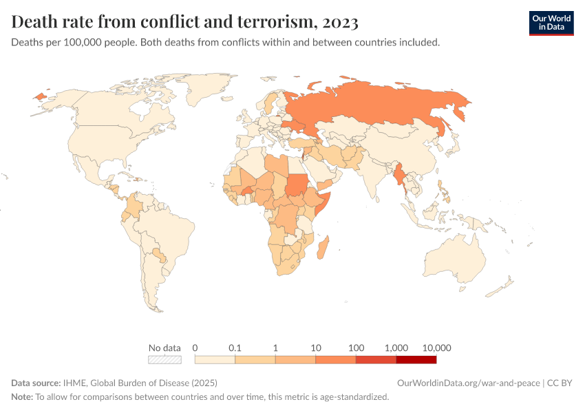 IHME, Global Burden of Disease (2024) – with minor processing by Our World in Data. “Death rate from conflict and terrorism” [dataset]. IHME, Global Burden of Disease, “Global Burden of Disease - Deaths and DALYs” [original data]. Retrieved January 9, 2026 from https://chrome-plugin.owid.pages.dev/grapher/death-rates-from-conflict-and-terrorism-gbd