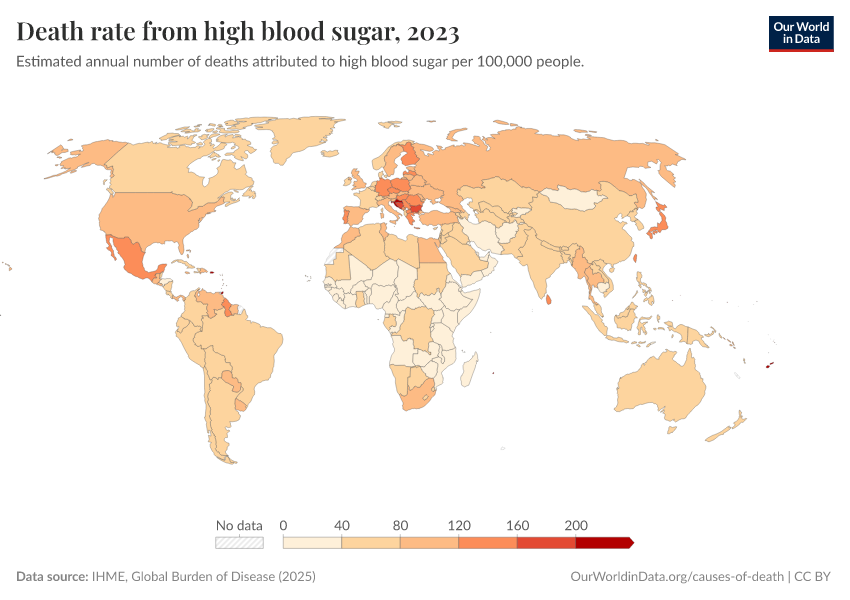 IHME, Global Burden of Disease (2024) – with minor processing by Our World in Data. “Death rate from high blood sugar” [dataset]. IHME, Global Burden of Disease, “Global Burden of Disease - Risk Factors” [original data]. Retrieved January 9, 2026 from https://chrome-plugin.owid.pages.dev/grapher/death-rates-from-high-blood-sugar-gbd