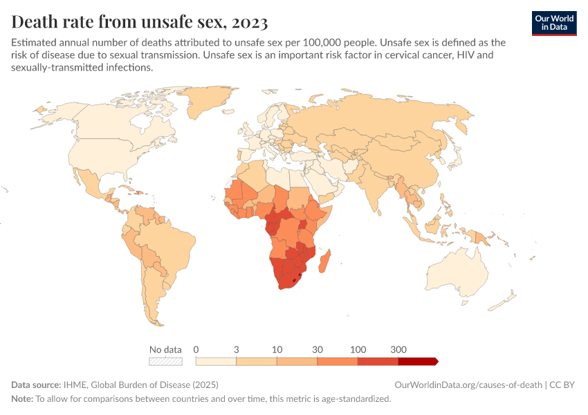 IHME, Global Burden of Disease (2024) – with minor processing by Our World in Data. “Death rate from unsafe sex” [dataset]. IHME, Global Burden of Disease, “Global Burden of Disease - Risk Factors” [original data]. Retrieved January 9, 2026 from https://chrome-plugin.owid.pages.dev/grapher/death-rates-from-unsafe-sex