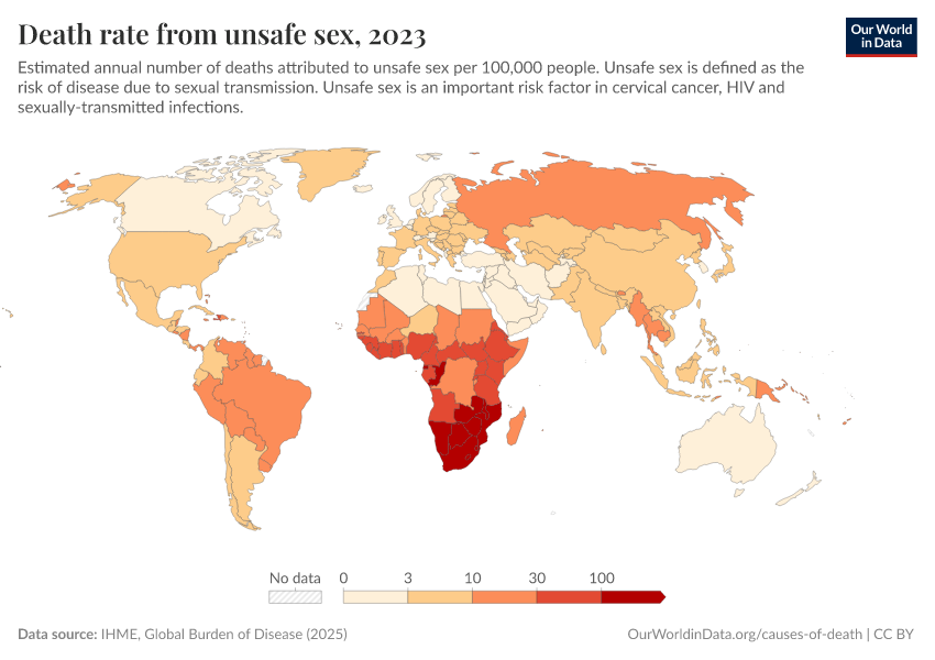 IHME, Global Burden of Disease (2024) – with minor processing by Our World in Data. “Death rate from unsafe sex” [dataset]. IHME, Global Burden of Disease, “Global Burden of Disease - Risk Factors” [original data]. Retrieved January 9, 2026 from https://chrome-plugin.owid.pages.dev/grapher/death-rates-from-unsafe-sex-gbd