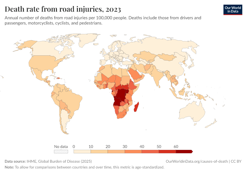 IHME, Global Burden of Disease (2024) – with minor processing by Our World in Data. “Death rate from road injuries” [dataset]. IHME, Global Burden of Disease, “Global Burden of Disease - Deaths and DALYs” [original data]. Retrieved January 9, 2026 from https://chrome-plugin.owid.pages.dev/grapher/death-rates-road-incidents