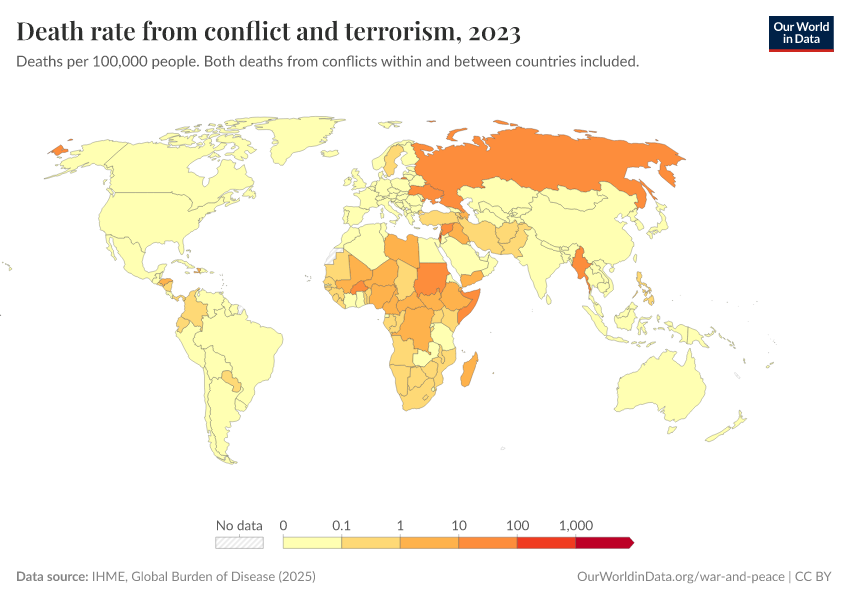 IHME, Global Burden of Disease (2024) – with minor processing by Our World in Data. “Death rate from conflict and terrorism” [dataset]. IHME, Global Burden of Disease, “Global Burden of Disease - Deaths and DALYs” [original data]. Retrieved January 9, 2026 from https://chrome-plugin.owid.pages.dev/grapher/deaths-conflict-terrorism-per-100000