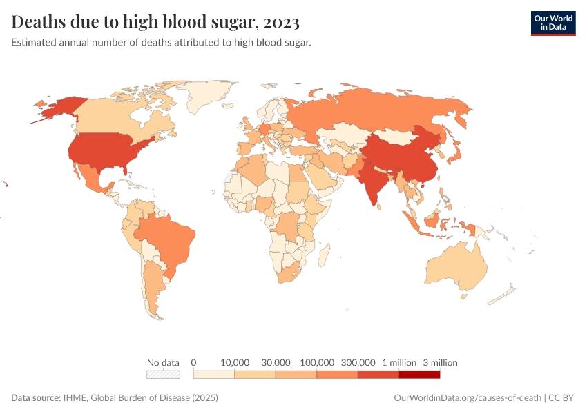 IHME, Global Burden of Disease (2024) – with minor processing by Our World in Data. “Deaths due to high blood sugar” [dataset]. IHME, Global Burden of Disease, “Global Burden of Disease - Risk Factors” [original data]. Retrieved January 9, 2026 from https://chrome-plugin.owid.pages.dev/grapher/deaths-due-to-high-blood-sugar